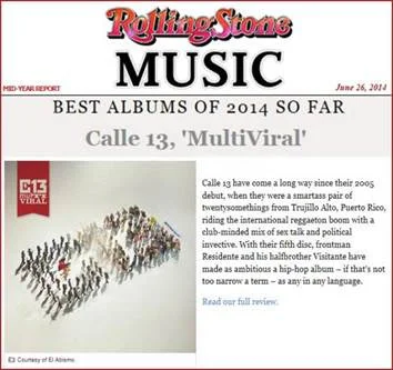 ROLLING STONE Recently Selected CALLE 13's "MultiViral" As One Of the Best Albums of 2014 -