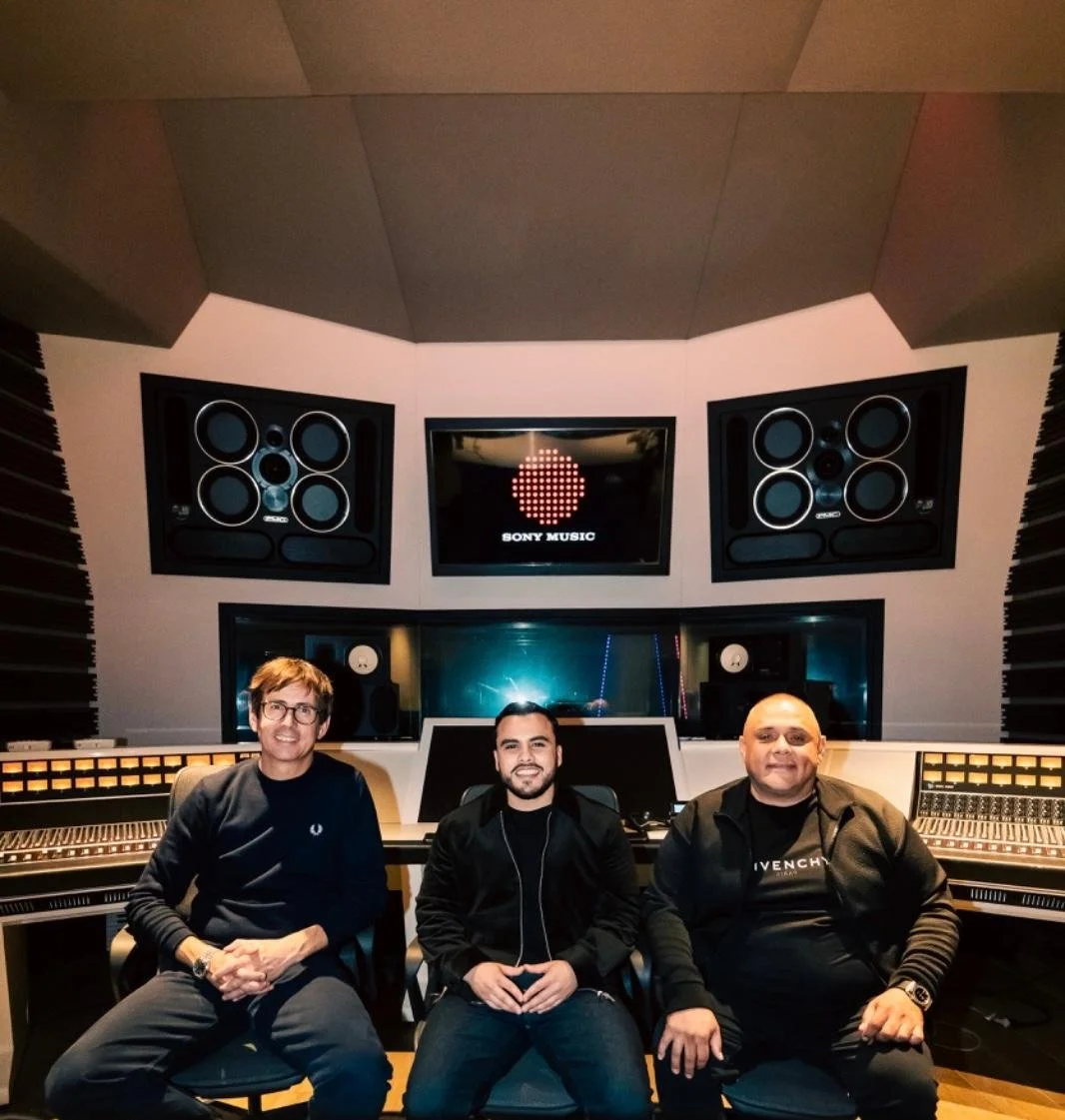 Abajo de Izquierda a derecha:Alex Gallardo (Presidente Us Latin Sony Music) , Ian Cordova, GMJ (CEO Lucky Music Group)