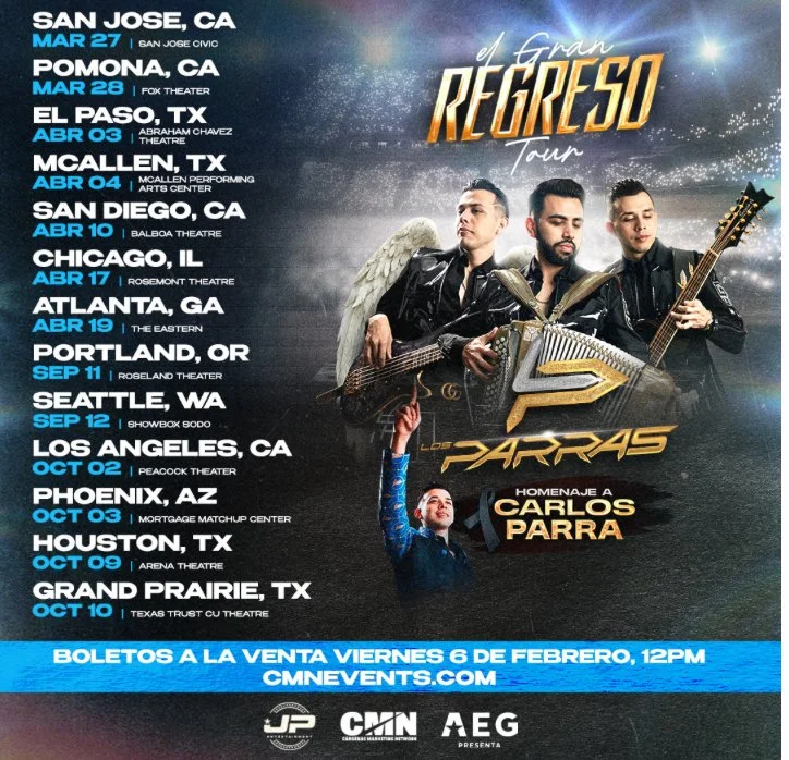 Los Parras, la agrupación de música regional mexicana, anuncian su primera gira por Estados Unidos, un homenaje que celebra la vida y el legado musical de Carlos Parra, producida por Cárdenas Marketing Network (CMN). La gira recorrerá 13 cuidades principales del país incluyendo a San José, Pomona, El Paso, McAllen, San Diego, Chicago, Atlanta, Portland, Seattle, Los Ángeles, Phoenix, Houston y Grand Prairie.