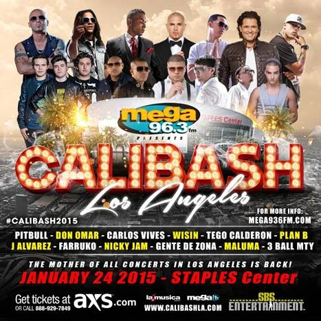 Los Angeles, CA (14 de noviembre de 2014) - SBS Entertainment (SBSE), la división de conciertos de (SBS) Spanish Broadcasting System, Inc. (Nasdaq: SBSA), AEG LIVE, la división de entretenimiento en vivo de la compañía AEG y la estación preferida de la juventud millennial latina en Los Angeles MEGA 96.3FM, anunciaron que los boletos para Calibash 2015 están a la venta desde las 12 p.m. del viernes 21 de noviembre de 2014. Calibash es el concierto más importante en el mundo que reúne las estrellas más trascendentales de la música latina y este año incluyen a Pitbull, Don Omar, Carlos Vives, Tego Calderón,Wisin, Plan B, J Alvarez, Farruko, 3BallMTY, Gente de Zona y Maluma.Calibash 2015, coproducido por SBS Entertainment and AEG LIVE contando con MEGA 96.3FM como la emisora de radio oficial, se llevará a cabo el sábado, 24 de enero de 2015 en STAPLES Center de Los Angeles, California. Los boletos pueden ser adquiridos en www.axs.com.