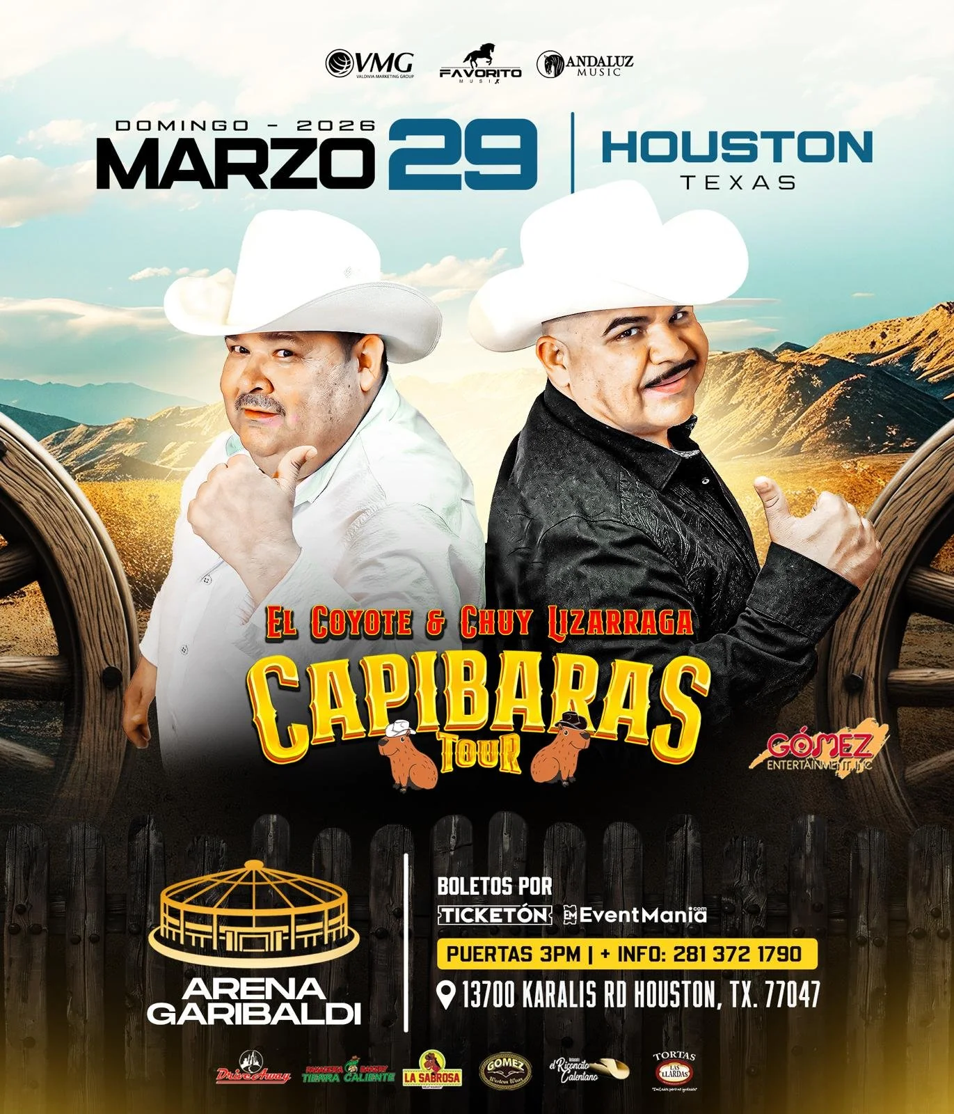 "CAPIBARAS TOUR", cuenta con la participación de dos íconos del regional mexicano, quienes unen su energía en un mismo escenario para ofrecer un espectáculo cargado de éxitos, banda sinaloense y el ambiente festivo que los ha convertido en favoritos del público.