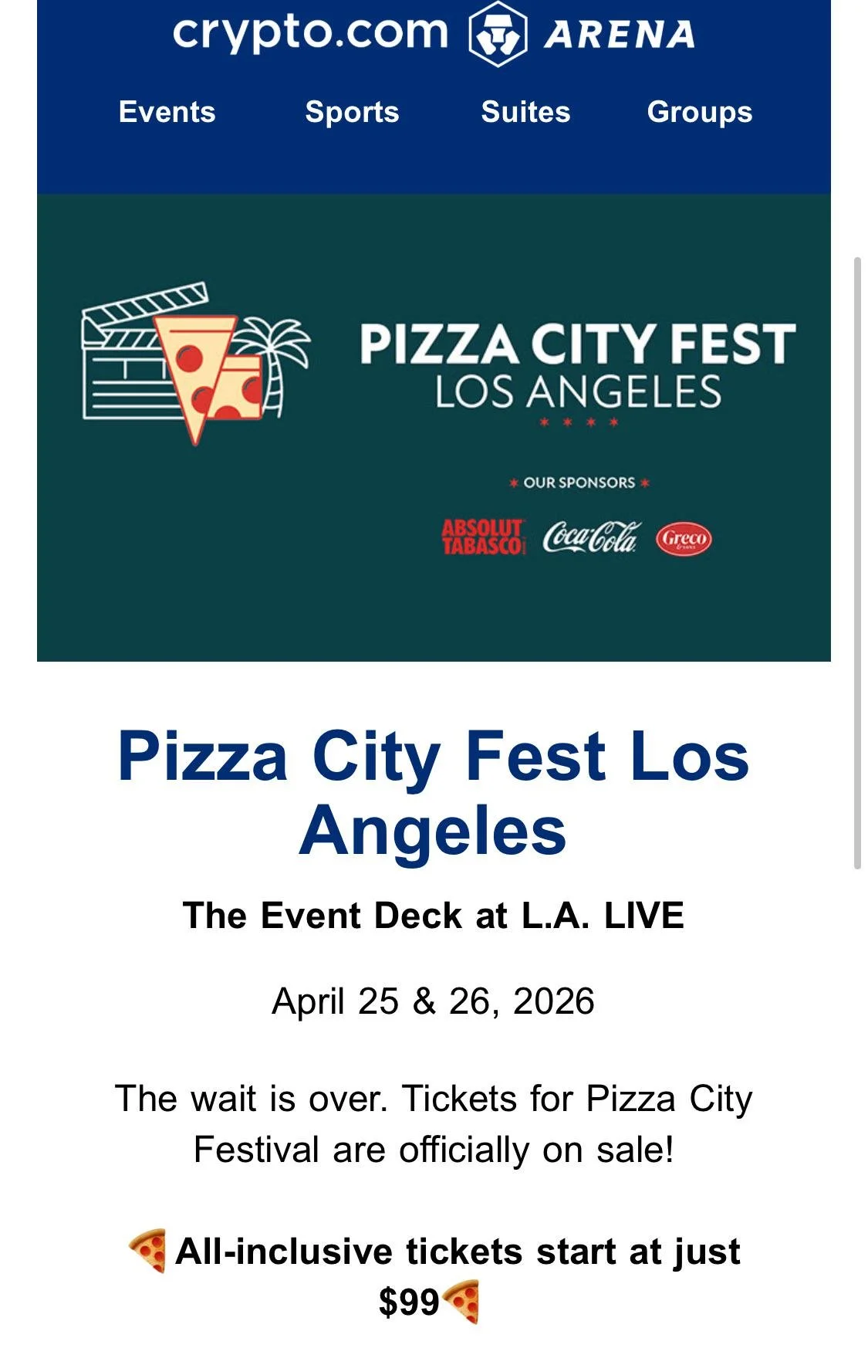 All tickets include unlimited pizza tastings, beverages, desserts and admission to the panel discussions and demos. Groups of 10 or more qualify for discounted ticket pricing. For more information, contact premiumevents@cryptoarena.com.