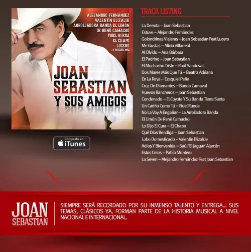 "JOAN SEBASTIAN Y SUS AMIGOS"... DISPONIBLE A PARTIR DE HOY View fullsize EspectaculosAlDiaSeptember 25, 2015FarandulaComment Facebook0 Twitter LinkedIn0 0 Likes