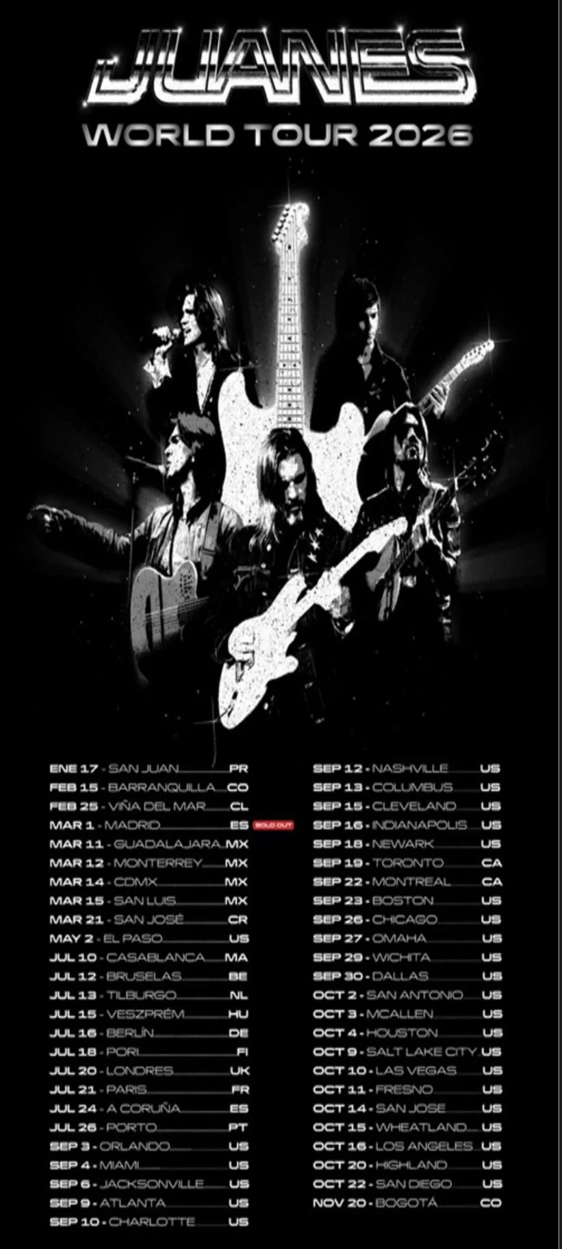 Tras haber realizado recientemente dos presentaciones principales en festivales en Puerto Rico y Barranquilla, JUANES se presentará próximamente como artista principal en los famosos festivales Viña del Mar (25 de febrero) y Vive Latino (14 de marzo), además de un show individual el 1 de marzo en el Movistar Arena de Madrid, ya totalmente agotado. A partir de ahí, el Juanes World Tour 2026 incluirá shows individuales adicionales en México (Guadalajara, Monterrey y San Luis Potosí), una visita a un festival en Costa Rica, un regreso a Europa, una extensa gira de 29 fechas visitando arenas y teatros de gran capacidad en Norteamérica, y un esperado show de regreso a casa en Bogotá en el Movistar Arena el 20 de noviembre (ver fechas abajo).