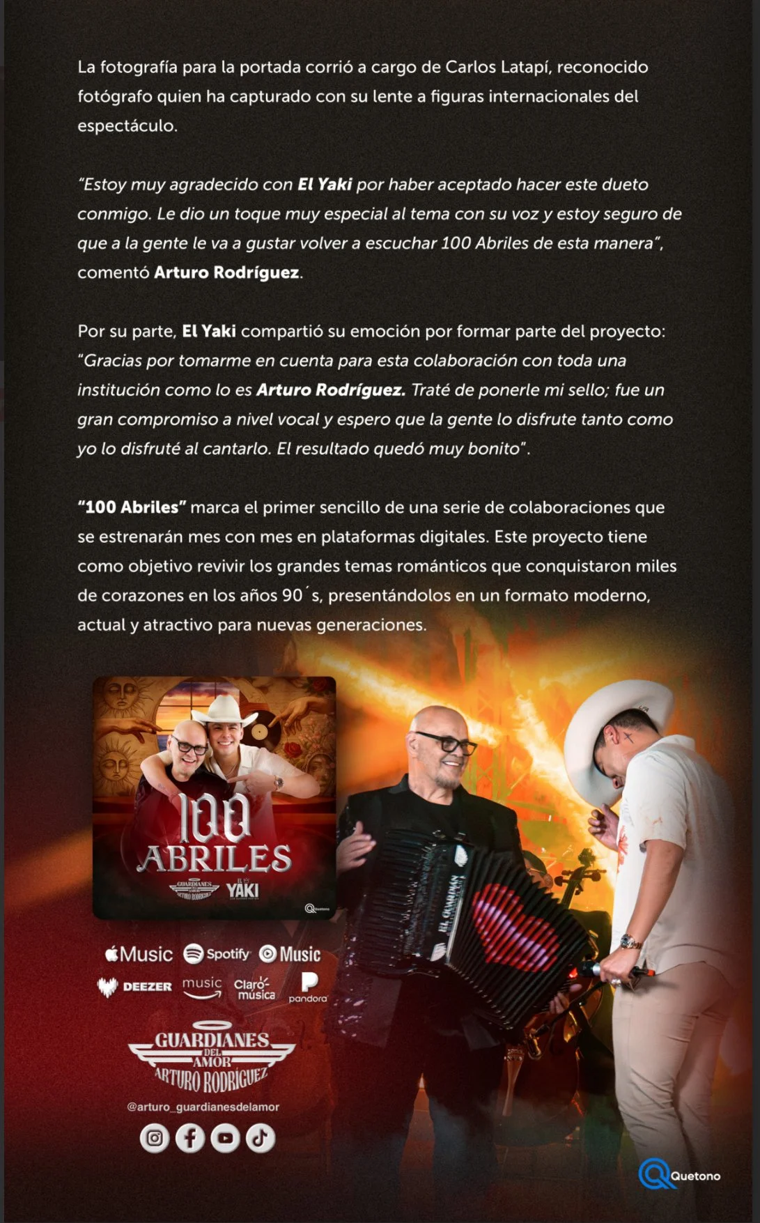 Lanzamiento | Guardianes del Amor y El Yaki – “100 Abriles” https://youtu.be/WJsOe7zsN64?si=yi2bo_sreQvCVCfj EspectaculosAlDiaFebruary 6, 2026 Facebook0 Twitter LinkedIn0 0 Likes